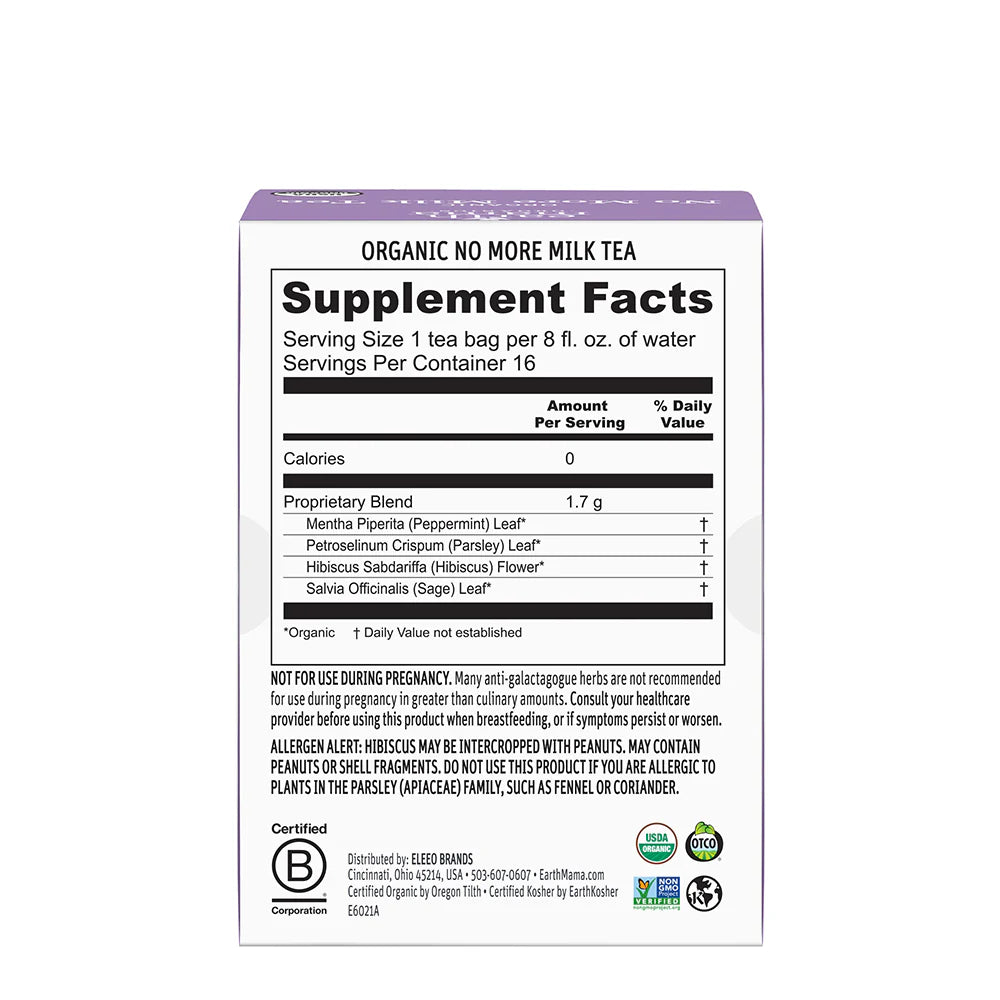 Earth Mama’s Organic No More Milk Tea is a blend of herbs historically used to help ease unwanted milk production, when weaning from breastfeeding to dry up breast milk or after miscarriage, pregnancy loss, or stillbirth. This USDA Certified Organic tea is naturally caffeine-free and thoughtfully formulated with sage, peppermint and parsley, alongside tangy hibiscus* flower.